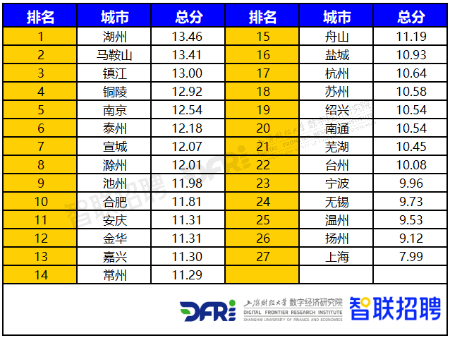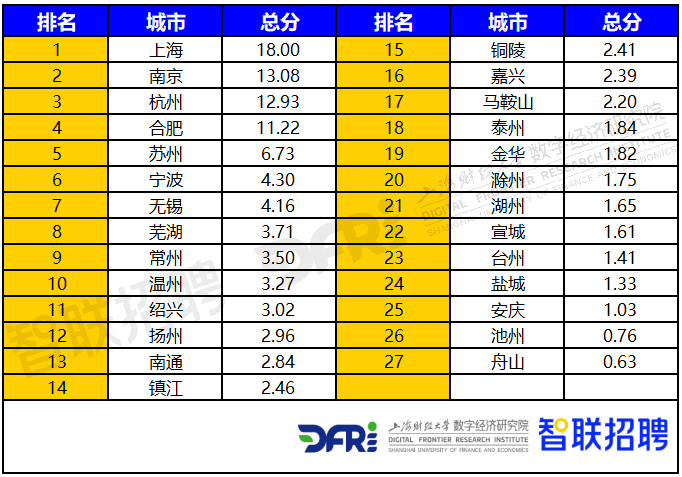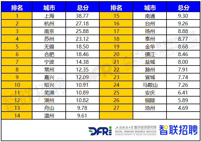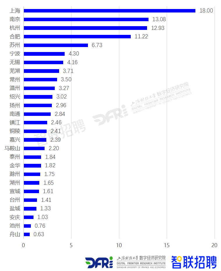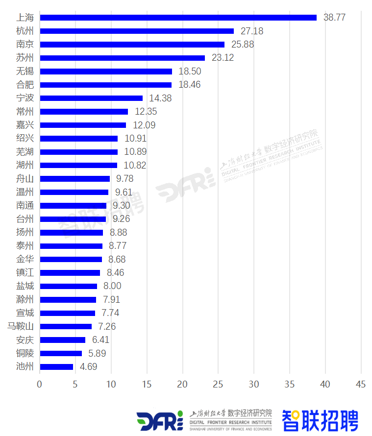 · 重要趋向性指标区域极化明显。在“新兴数字岗位”“中高端数字岗位”“人才净流入”等指标上,上海、杭州、苏州、南京、合肥、无锡六座城市均居前六位,合计占27个城市的比重分别达86.50%、88.76%、87.1%。