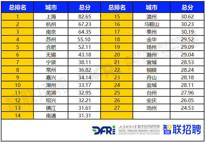 上海以82.65分唯一登顶,领先优势显著,超第2名15分以上,凸显其作为长三角数字经济核心引擎的不可撼动领军地位。