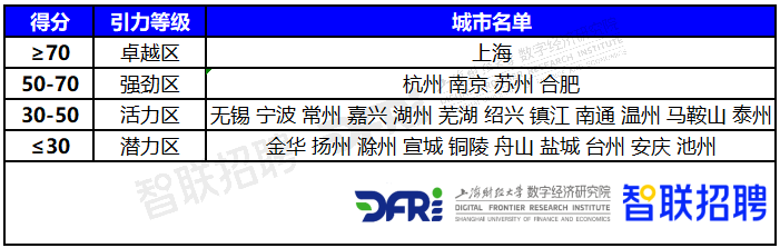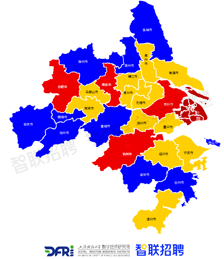 · 长三角中心区城市数字人才吸引力区域极化明显。上海一骑绝尘,显著领先其他城市,处于数字人才引力卓越区,杭州、南京、苏州、合肥紧随其后。这五座城市成为长三角地区吸引数字人才的“富集地区”。