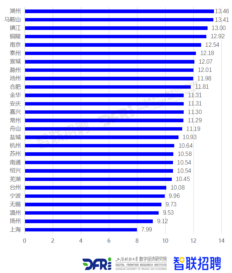 无锡作为该区间首城,数字经济沉淀深厚,在人才吸引上具有较大领先优势。宁波、常州、嘉兴、湖州、芜湖、绍兴、镇江、南通、温州、马鞍山、泰州等12个城市,除无锡外,分差较小,这些城市竞争处于胶着态势,成为长三角中心区吸引数字人才的生力军。