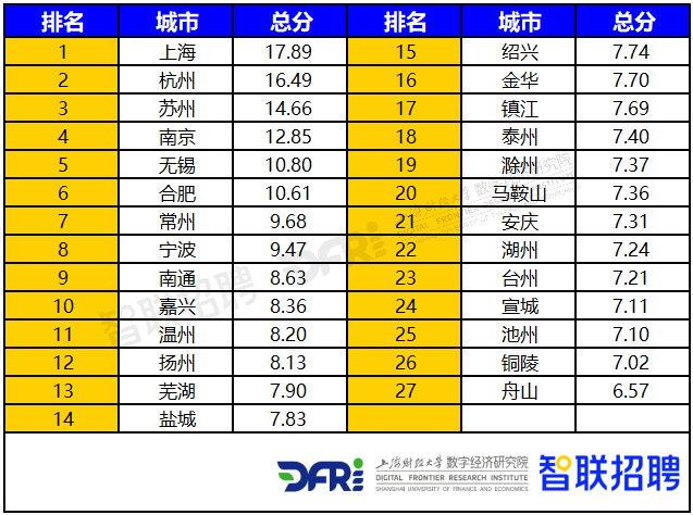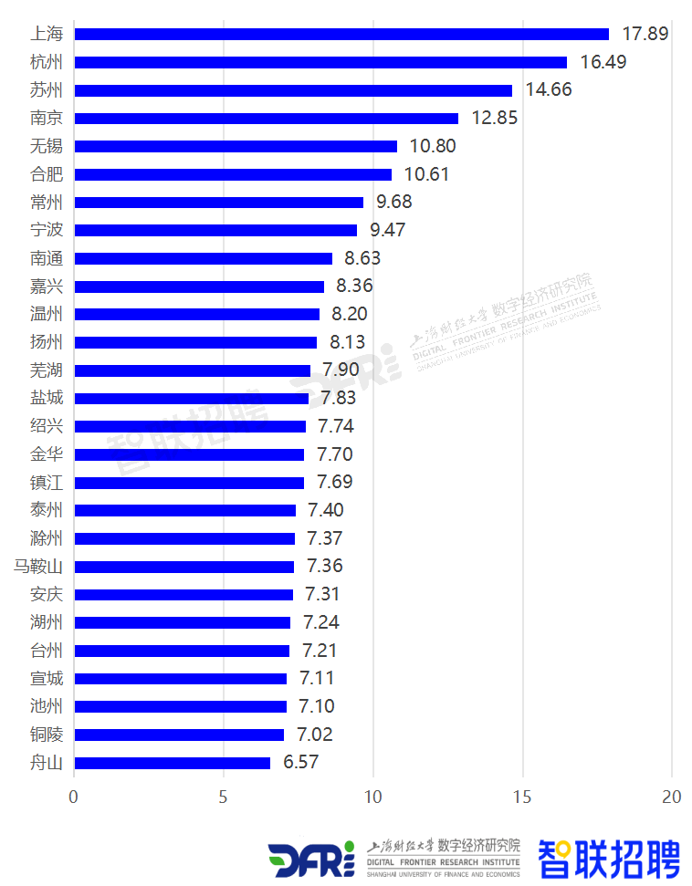 上海、杭州、苏州、南京、无锡、合肥位居前列,显示出较强的产业集聚效应和经济活力。领先城市在数字经济核心产业占比、规模化企业营收、独角兽企业数量以及新兴技术企业密度等方面表现突出,体现出完善的产业生态和较强的竞争力。
