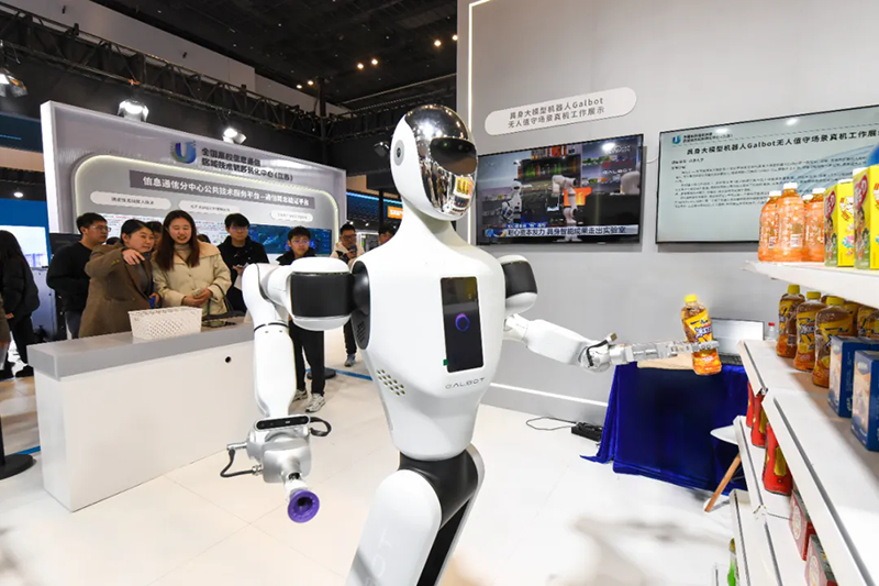 参观者在中国高校科技成果交易会上观看展出的自动售货机器人